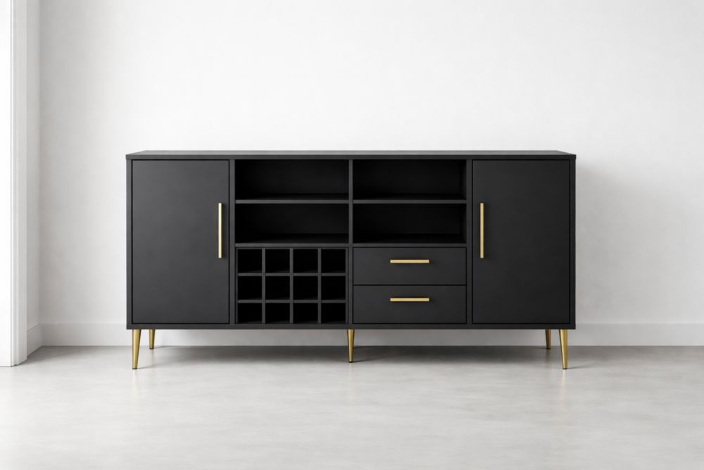 Black Bar Cabinet with Gold Legs and Storage Shelves