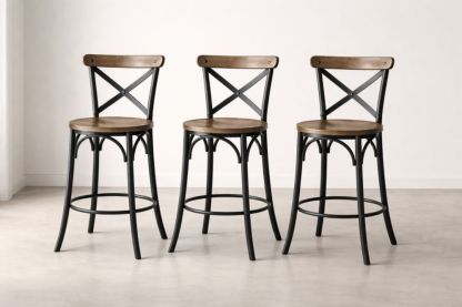 Set of 3 Counter Height Stools Wood Seat Metal Frame Brown Black