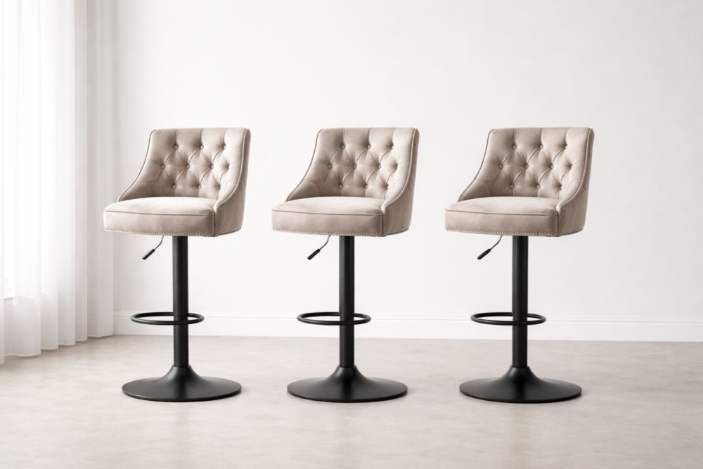 Set of 3 Taupe Upholstered Swivel Bar Stools with Adjustable Height and Black Metal Base